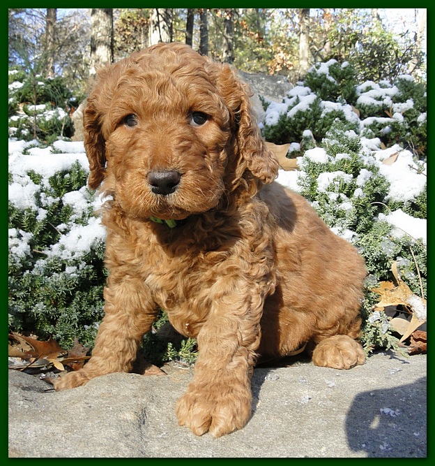 5 weeks old, weight: 6 lbs 6 oz, first outside snow, first parvo shot, eating softened kibble, cutting teeth.